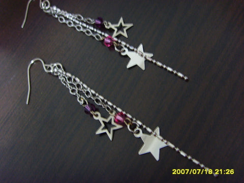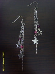 Twinkle star earring. Made with pure silver platings, pure silver chains, pink and purple swarovski crystals. Approximately 7cm long.
